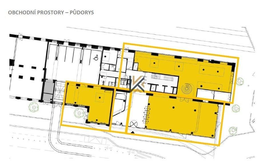 Obchodní prostory 566 m2 (306 m2+ 260 m2) v přízemí. Nájemné 30-40 EUR/m2, služby 130 Kč/m2, dokončení 1Q/2028.