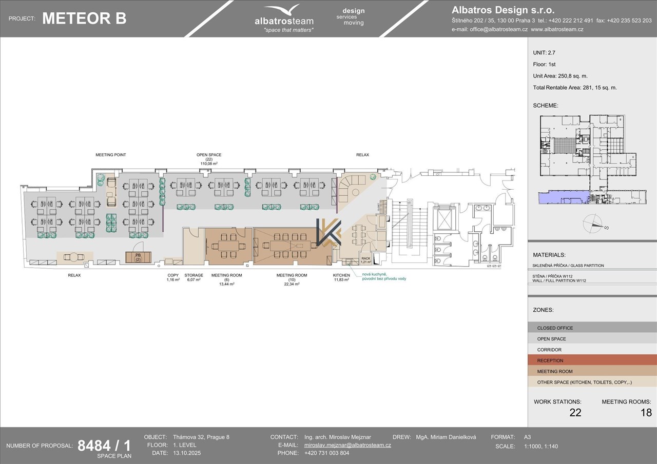 Kancelářské prostory o celkové výměře 281 m2 v 1. patře v budově METEOR B.