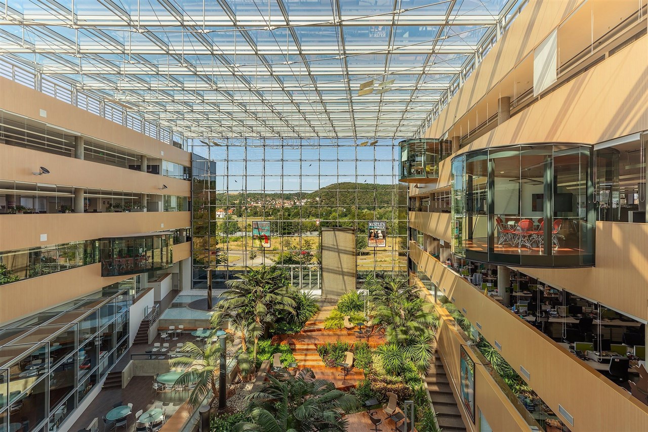 které přirozeně ústí v prostornou terasu. V atriu si můžete vychutnat lahodný šálek kávy z kavárny Nestlé Coffee House vybudované v roce 2023 ve spolupráci s majoritním nájemcem Nestlé. K vysokému pracovnímu komfortu přispívá také vynikající jídelna přístupná všem nájemcům, kolárna nebo AlzaBox.