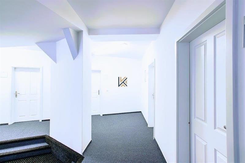 Kancelář o výměře 22 m2. Kuchyňka a toalety jsou společné na patře.
