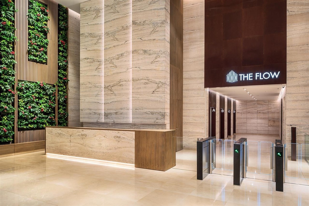 Budova The Flow Building představuje kombinaci jedinečného designu 21. století a nejnovějších technických řešení. Předností projektu jsou rozměrné flexibilní prostory a velké množství přirozeného denního světla. Budova byla navržena tak, aby nabídla pasivní metody ke snížení spotřeby energie nájemců. Jedinečná fasáda vystupující ve vyšších patrech přes linii chodníku a využívající trojrozměrný modulární systém, aby bylo docíleno kontinuálního zakřivení jejího povrchu. Vstupní recepce s výškou 8 metrů k níž přiléhá výtahové lobby působí díky kombinaci velkoformátového přírodního kamene, teplých tónů dřeva a výrazných prvků zeleně, minimalistickým, přesto však luxusním dojmem.